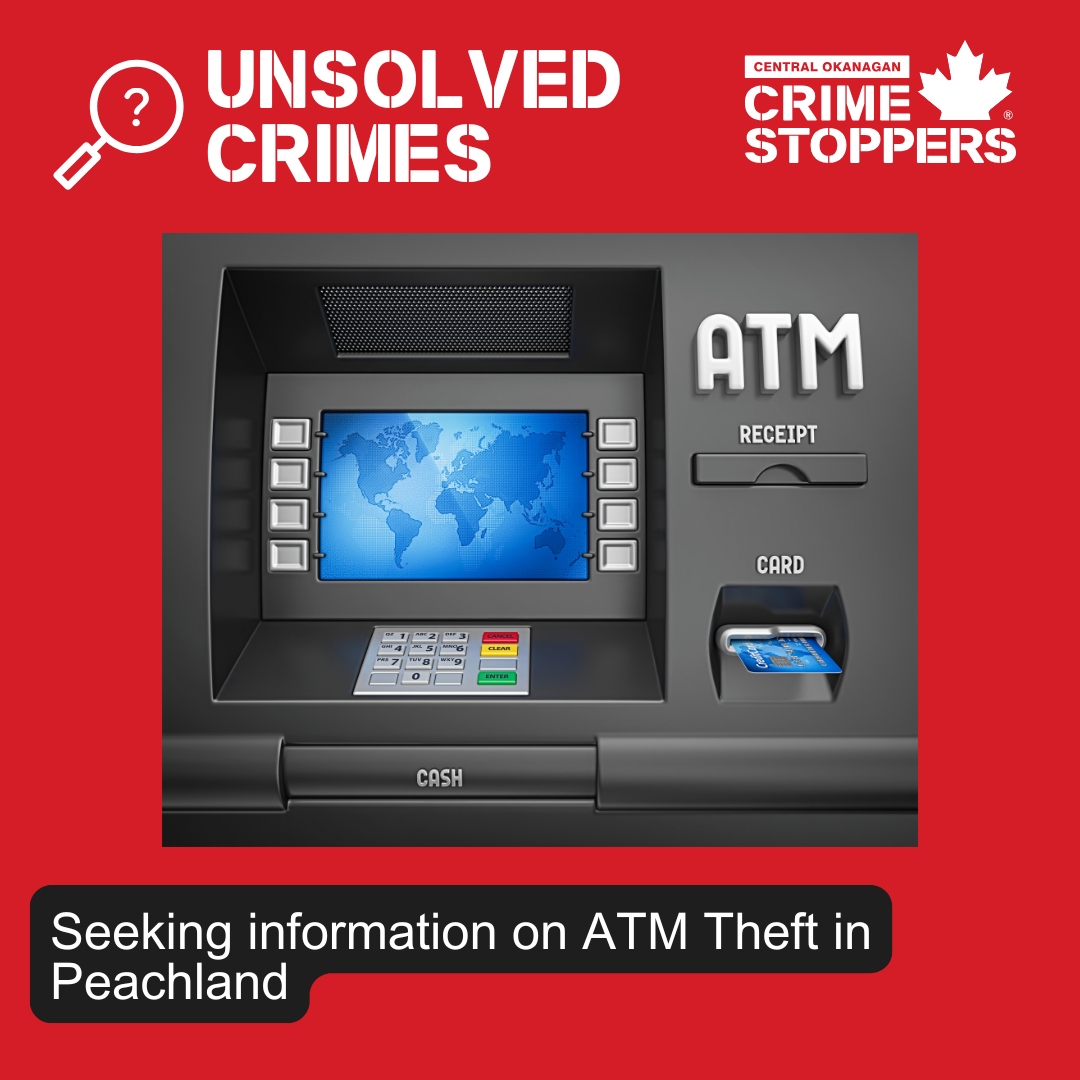 West Kelowna RCMP is investigating an ATM theft on Oct. 8, 2025, around 4:26 a.m. at a bank in the 5500 block of Clements Crescent. Suspects used a front-end loader and pickup to rip out the deposit box, later abandoning both vehicles and the box nearby.