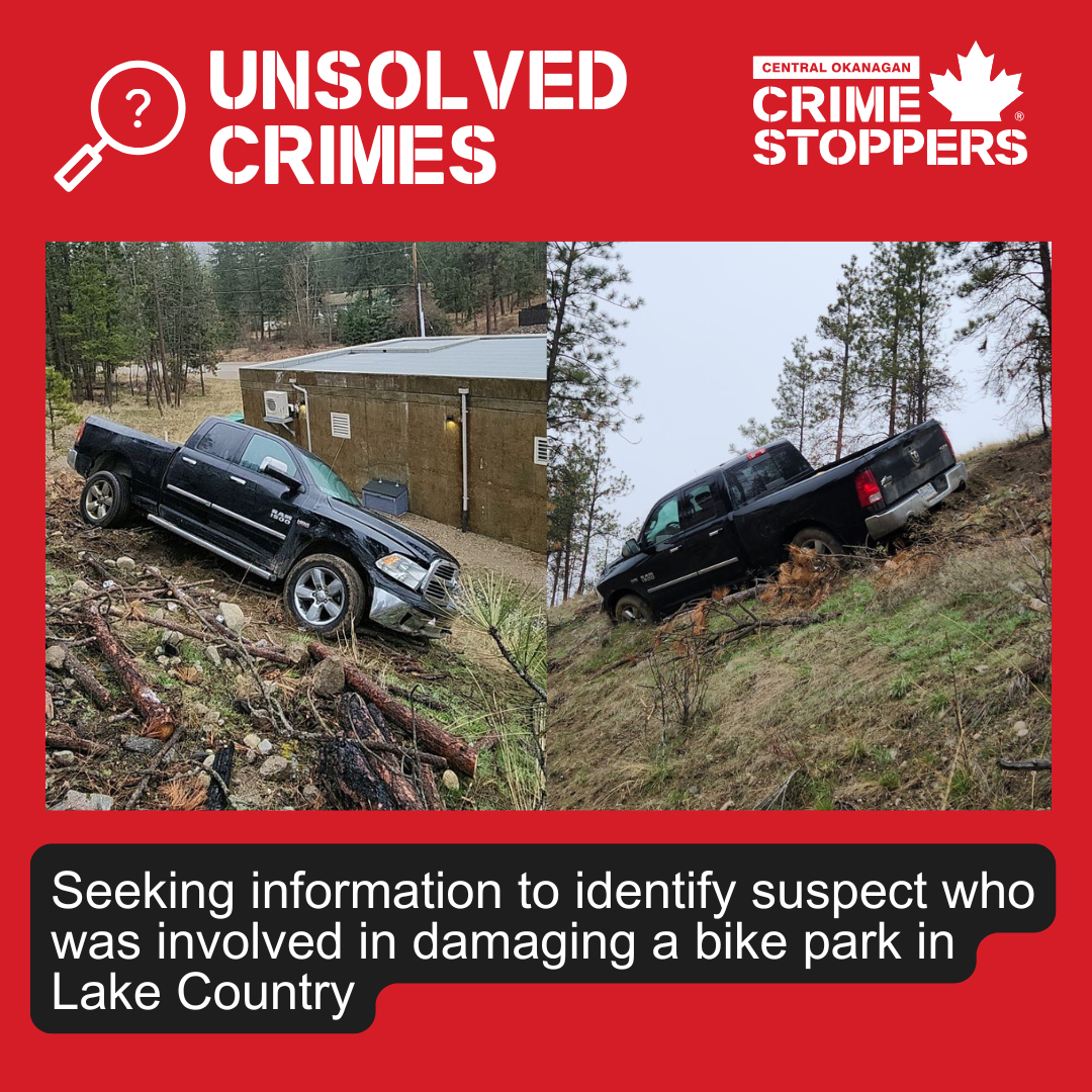 A 2014 Dodge truck drove onto trails at Lake Country Bike Park (8865 Okanagan Centre Rd W), causing damage when the bank gave way. The truck was later found uninsured and the driver fled before RCMP arrived. Police are investigating and charges may follow.