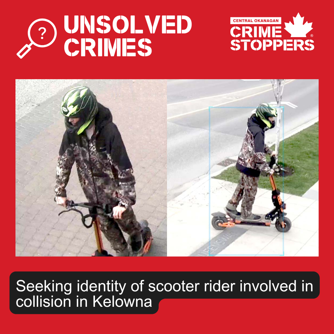 Kelowna RCMP responded to a collision between two motorized scooters on the 800-block of Ellis Street. One man was hospitalized with non-life-threatening injuries; the other rider left before police arrived. He is described as a slim, shorter male wearing a helmet and camouflage jacket, riding a black and orange scooter.