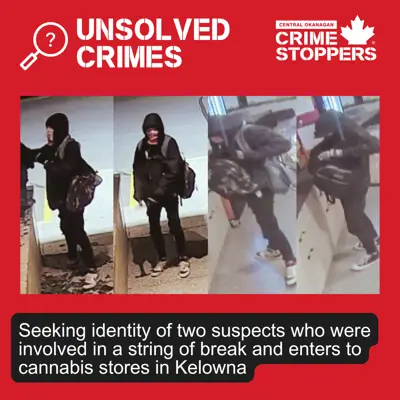 The Kelowna RCMP is seeking witnesses to identify these suspects who were involved in a string of break and enters to various cannabis stores.