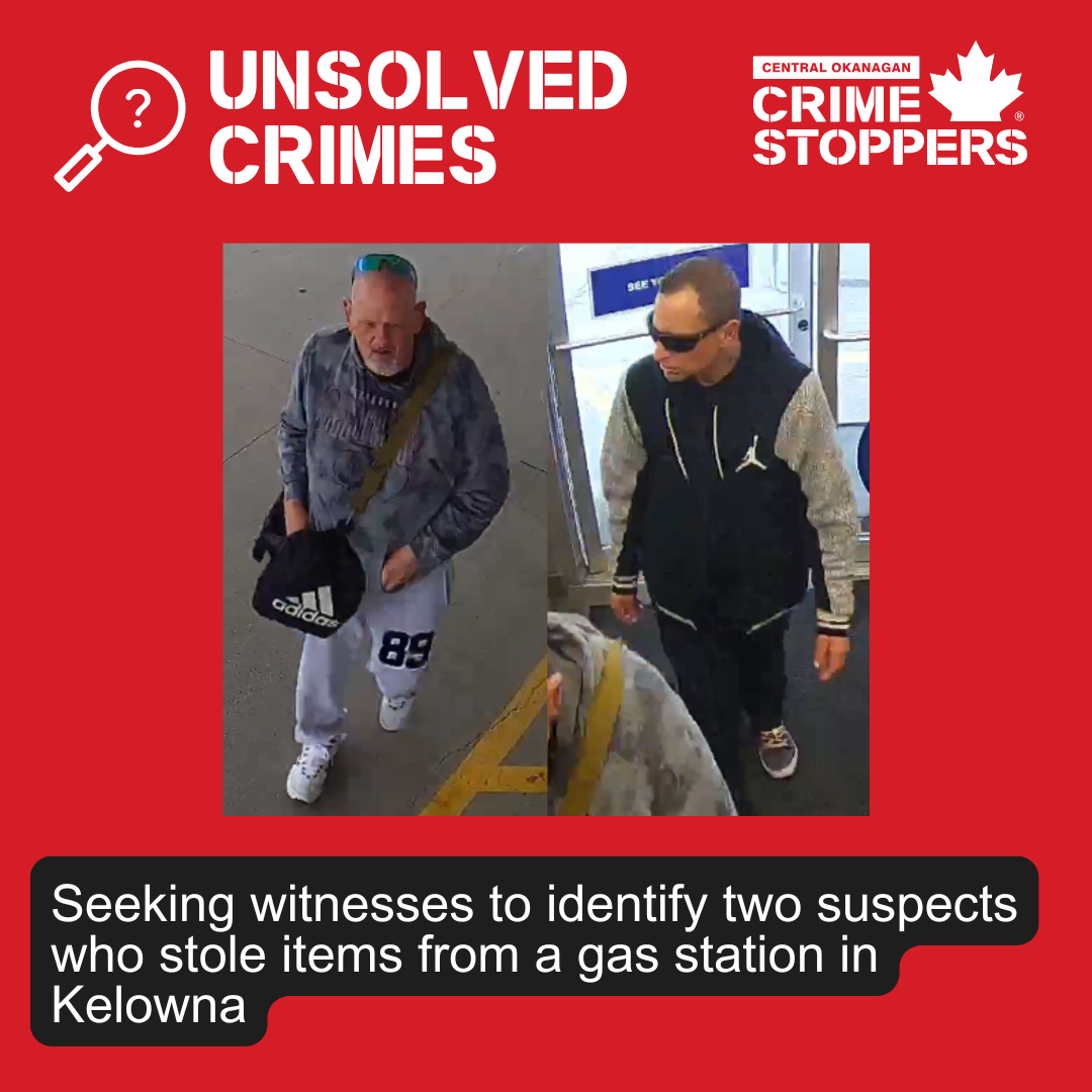 On April 7, 2025 two suspects stole items from a local gas station. The RCMP is seeking witnesses to identify the suspects.