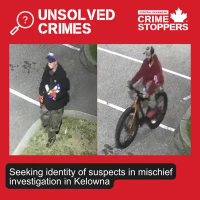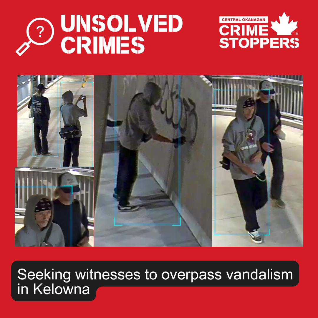 Kelowna RCMP is investigating hate-motivated graffiti, containing discriminatory language, at Rutland Arena (600-block Dodd Rd), reported Aug. 19, 2025. Two suspects were seen spray-painting around 12:30 a.m. Aug. 17.