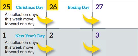 There will be no collection on Christmas Day (Thursday, December 25) or New Year’s Day (Thursday, January 1). As a result, curbside collection moves to the next day for residents with Thursday and Friday collection, for two weeks: