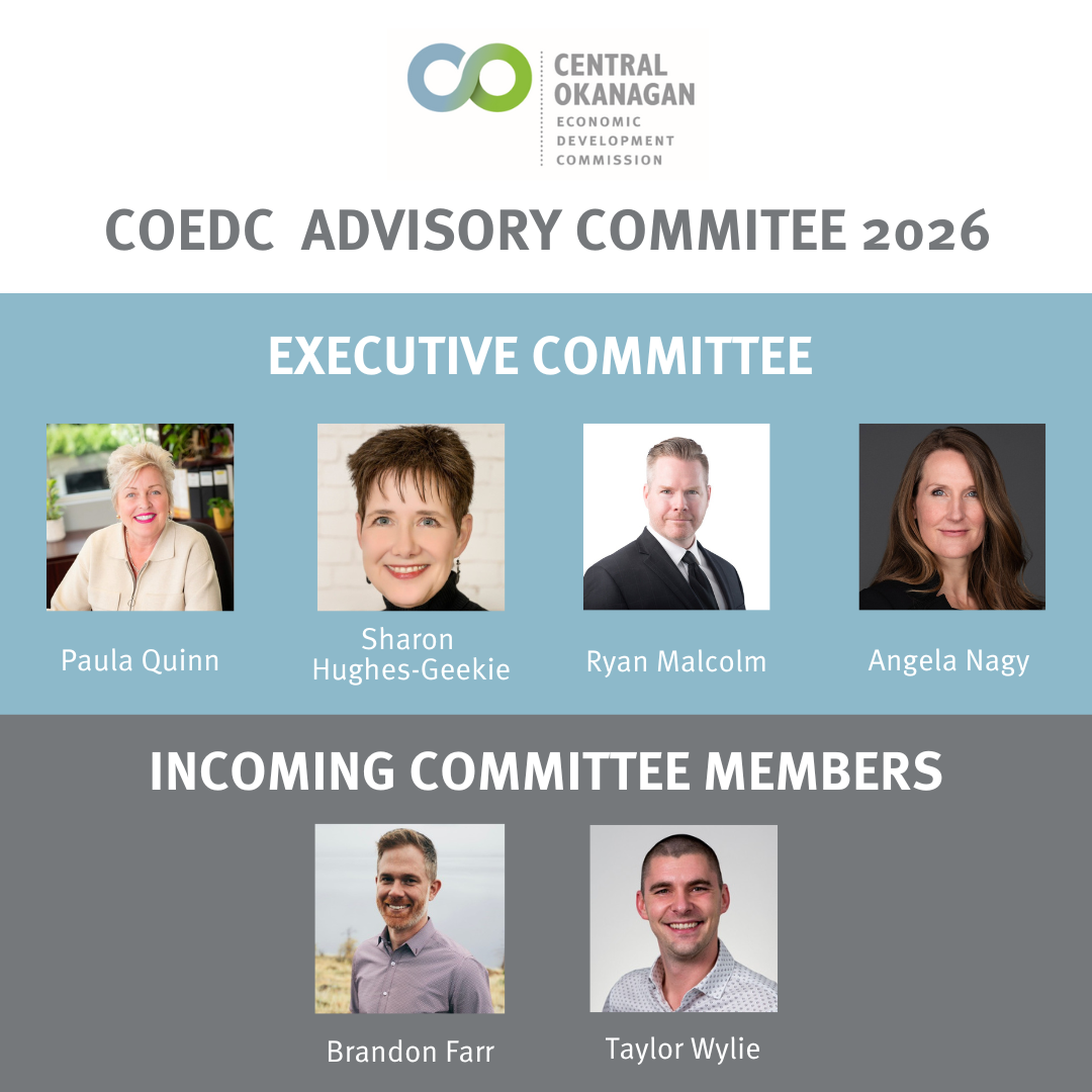 The Central Okanagan Economic Development Commission (COEDC) is excited to announce the incoming members of its Advisory Committee for 2026. This 45-member committee, comprised of industry leaders, elected officials, local government staff and community organization representatives, provides valuable insights to the COEDC. The committee convenes monthly to exchange information and works to foster sustainable economic growth in the region.