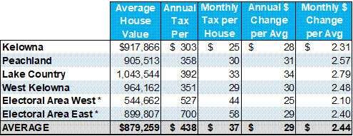 Unlike municipalities, regional districts do not have a single tax rate. The impact on each property owner varies depending on where they live, the services they receive and the assessed value of their property. Preliminary average tax impacts for each community within the Central Okanagan are outlined below: