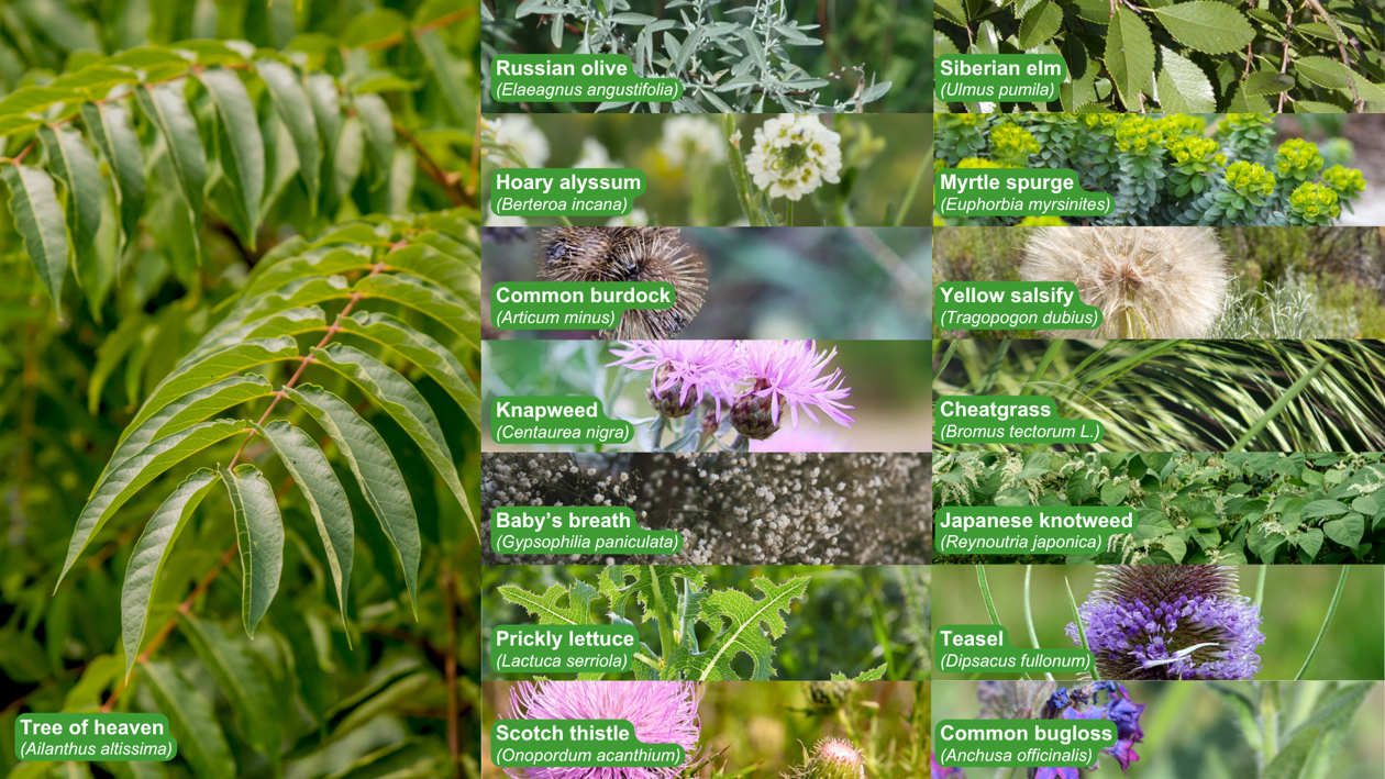 The RDCO is also monitoring other invasive weeds that affect farms, livestock, natural areas and wildfire behaviour. These include species that harm animals or contaminate hay (Hoary Alyssum, Prickly Lettuce, Common Bugloss, Cheatgrass); plants that are hazardous or difficult to remove (Japanese Knotweed, Myrtle Spurge, Scotch Thistle, Teasel); species that reduce crop productivity (Yellow Salsify, Common Burdock, Knapweed); and fast‑spreading plants like Baby’s Breath, which can increase wildfire risk. Russian Olive and Siberian Elm are also concerns because they grow aggressively and displace native plants. These invasive species spread easily and can cause long‑term damage if not controlled early.